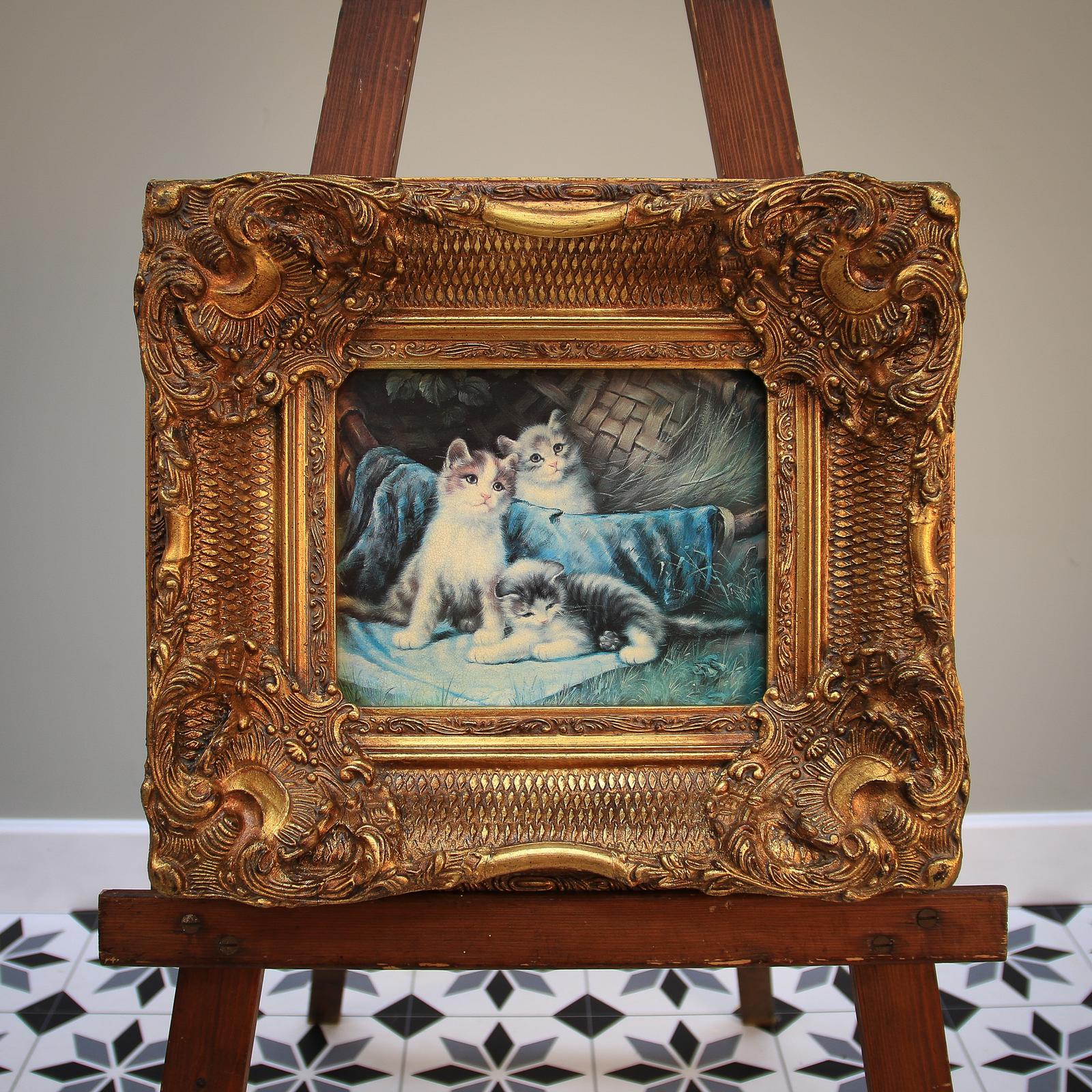 Gorgeous exaggerated gesso and gilt frame around a picture of cats. The frame is the real attraction with great labels on the back.