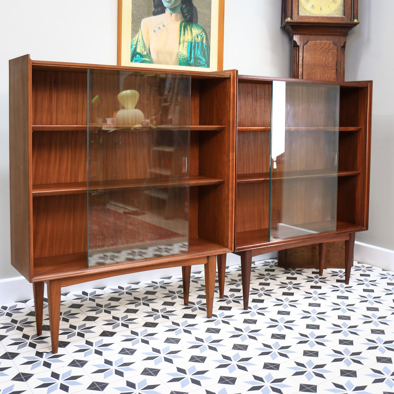 A pair of Richard Hornby for Fyne Ladye Teak Book Cases with two glazed sliding doors, two adjustable wooden shelves standing on square legs with a low galleried top. In super condition. They are slightly different shades of teaks one is that deep Afromosia Reddish Brown the other has mellowed with light and age. See Images